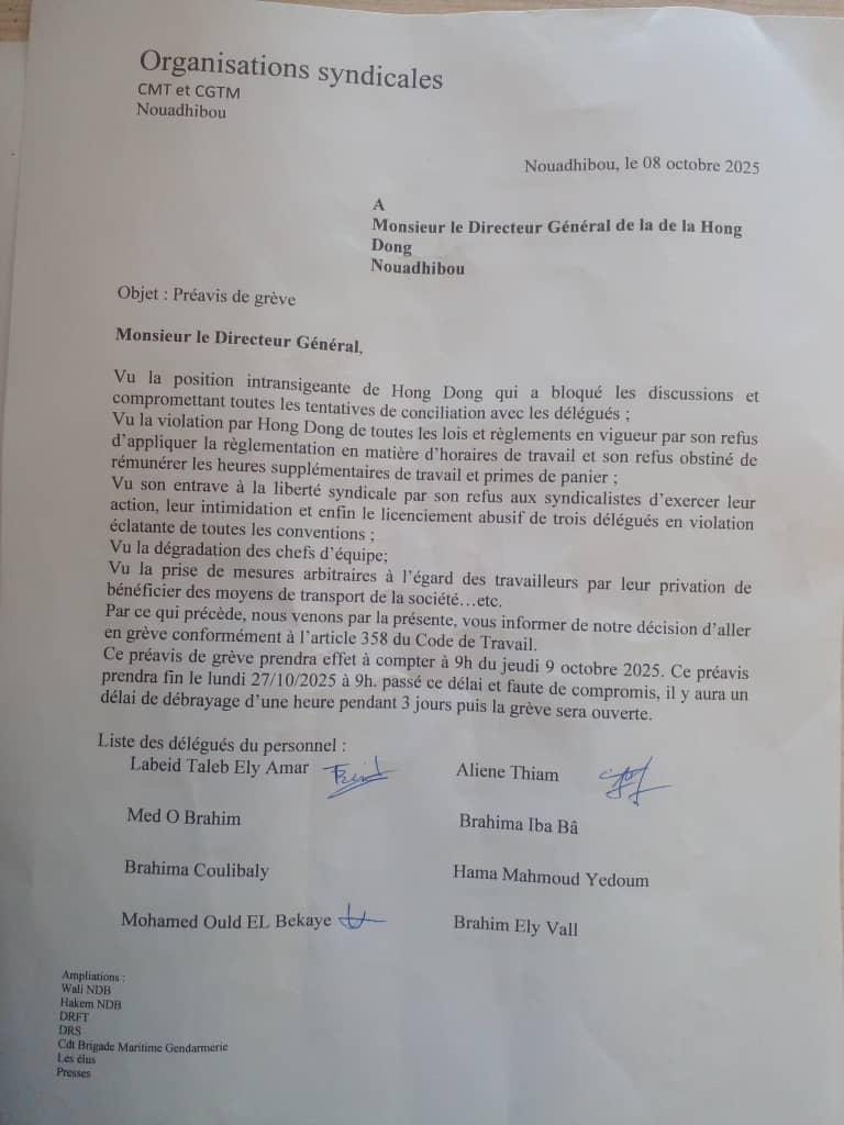 ووفق الرسالة فإن الإشعار بالإضراب سلم للشركة اليوم 9 أكتوبر وينتهي في غضون 15 يوما ، وفي حال عدم تسوية المشكل فإنه سيبدأون في الإضراب بالتدريج.