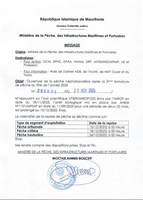 قررت وزارة الصيد والبنى التحتية البحرية والمينائية تمديد التوقيف البيولوجي 15 يوما إضافيا بعد أن كان مقررا أن يكون في فاتح دسمبر 2025.