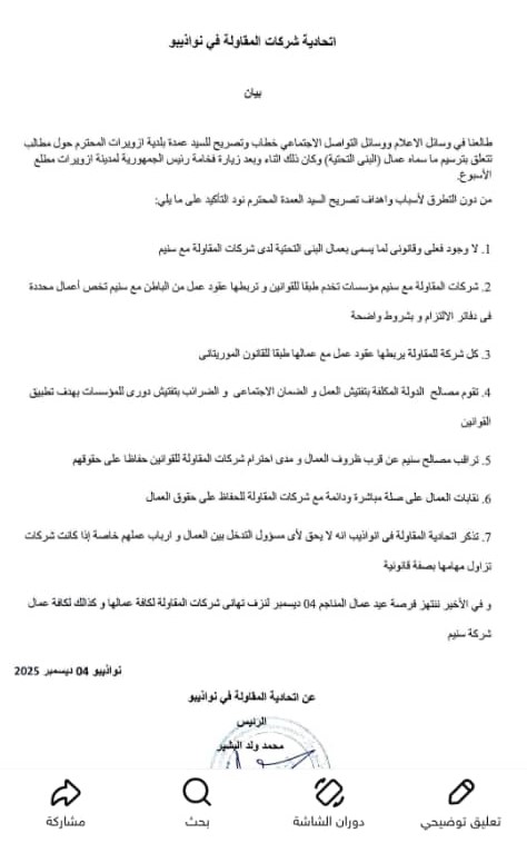 نفت اتحادية المقاولات في نواذيبو وجود فعلي أو قانوني لعمال البنى التحتية لدى شركات المقاولة مع اسنيم.