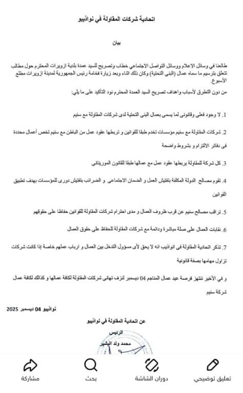 ورأى البيان أن اتحادية المقاولات طالعت في وسائل الإعلام ووسائل التواصل الاجتماعي خطاب وتصريح عمدة بلدية أزويرات حول مطالب تتعلق بترسيم ماسماه بعمال البنى التحتية وذلك على هامش زيارة رئيس الجمهورية للمدينة.
