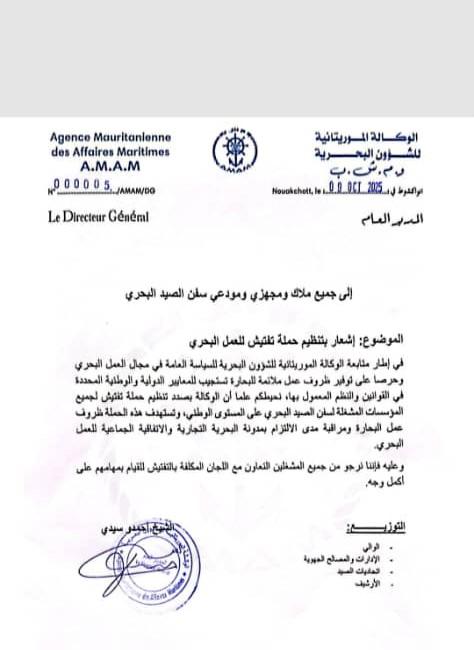 في خطوة وصفت ب"السابقة"، أعلنت الوكالة الموريتانية للشؤون البحرية نيتها إجراء تفتيش شامل في مؤسسات الصيد في عموم التراب الوطني.